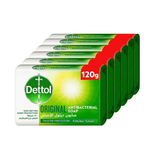 Dettol original bar soap 120g x 6 Helps moisturize dry skin. kills germs; Thanks to Dettol's advanced formula. It helps purify the skin from impurities and microbes. It forms a layer of protection for the skin from disease-causing germs. How to use: Wet the...