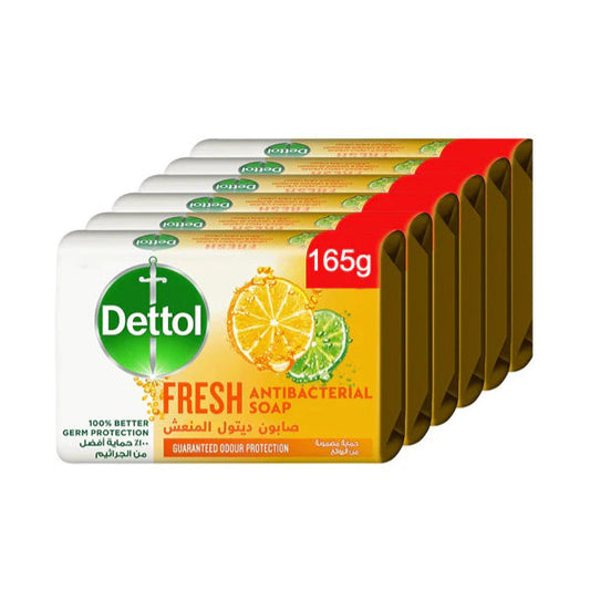 Dettol Refreshing Bar Soap 165g x 6: It helps purify the skin from impurities and microbes. Kills germs, thanks to Dettol's advanced formula. The refreshing lemon scent, which helps you feel fresh, for as long as possible. Helps moisturize dry skin. It provides the...