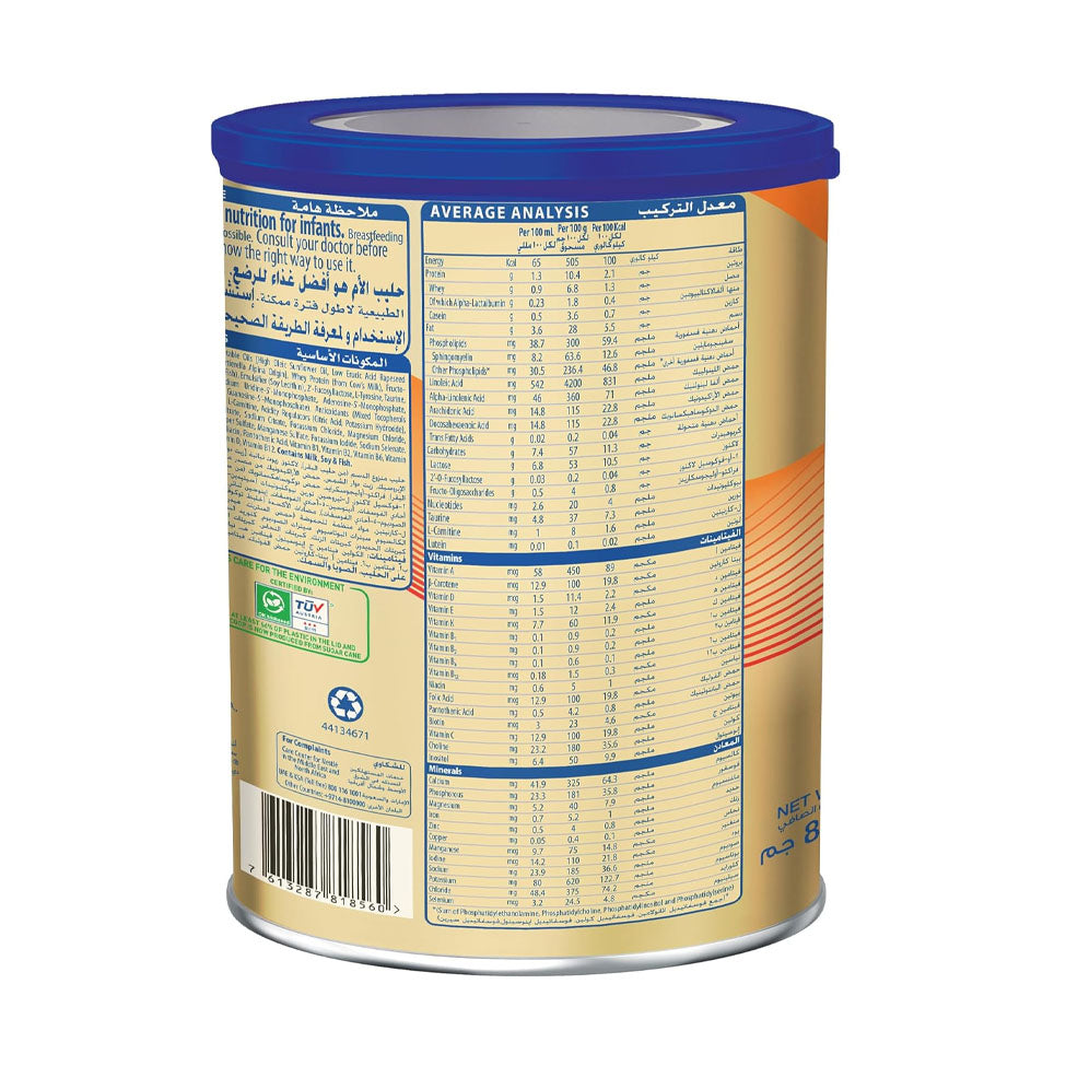 Low Erucic Kale, Sunflower Oil, Arachidonic Acid (from Morterella Alpina Source), Whey Protein (from Cow's Milk), Fructooligosaccharides, DHA (from Tuna Fish), Emulsifying Agent (Soy Lecithin), 2-Voxylactose, L- Tyrosine, Taurine, Nucleotides (Cytidine 5-monophosphate, Disodium uridine 5-monophosphate, Adenosine 5-monophosphate, Disodium inosine 5-monophosphate, Disodium guanosine 5-monophosphate), Antioxidants (Mixed Tocopherol Concentrate, L-Ascorbyl Palmitate), L-tryptophan, L-carnitine, acidity regulators (citric acid, potassium hydroxide), lutein.