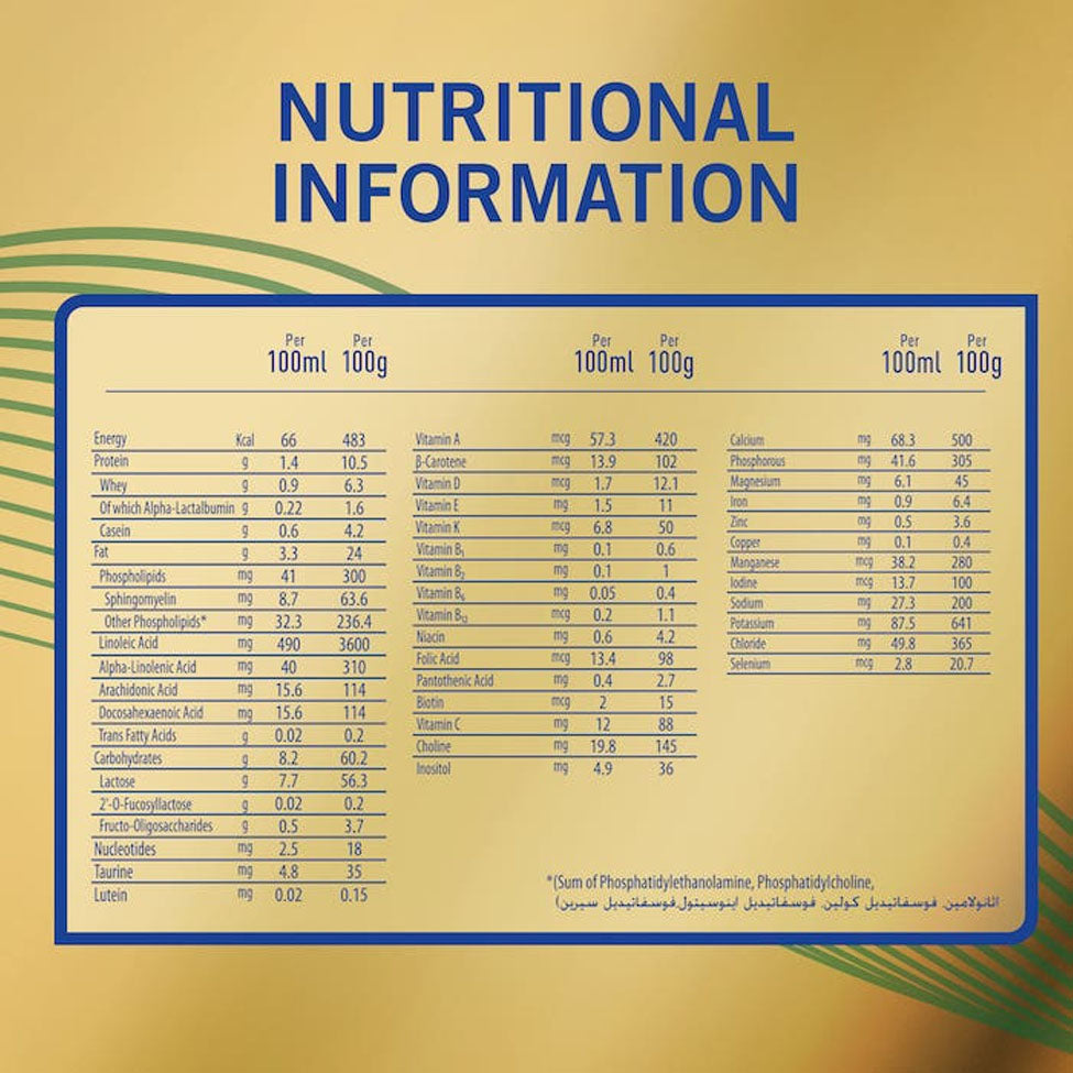 Low Erucic Kale, Sunflower Oil, Arachidonic Acid (from Morterella Alpina Source), Whey Protein (from Cow's Milk), Fructooligosaccharides, DHA (from Tuna Fish), Emulsifying Agent (Soy Lecithin), 2-Voxylactose, L- Tyrosine, Taurine, Nucleotides (Cytidine 5-monophosphate, Disodium uridine 5-monophosphate, Adenosine 5-monophosphate, Disodium inosine 5-monophosphate, Disodium guanosine 5-monophosphate), Antioxidants (Mixed Tocopherol Concentrate, L-Ascorbyl Palmitate), L-tryptophan, L-carnitine, acidity regulators (citric acid, potassium hydroxide), lutein.