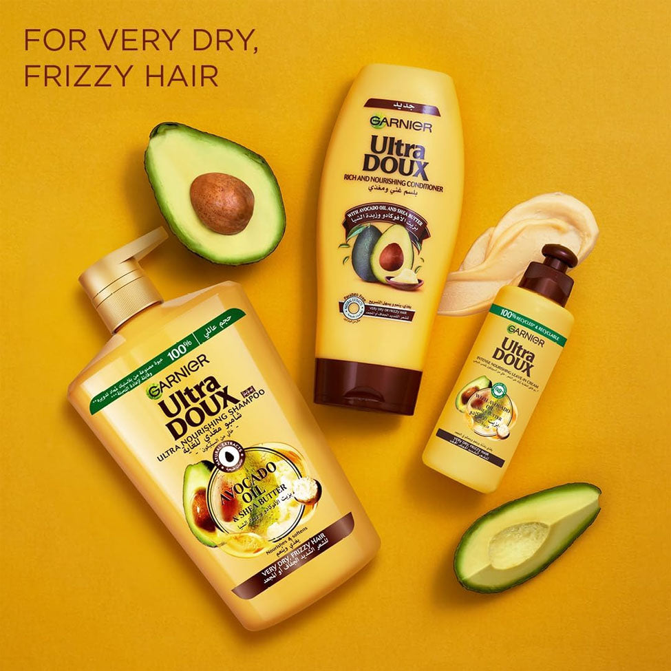 Garnier Ultra Doux Shampoo with Avocado Oil and Shea Butter - a real recipe that deeply nourishes very dry or frizzy hair. This recipe combines avocado oil, known for its softening properties, and shea butter, known for its superior ability to nourish the skin without weighing it down.