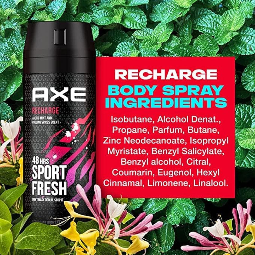 - AXE Recharge body spray deodorant provides long-lasting freshness and energy that keeps you feeling confident all day long.