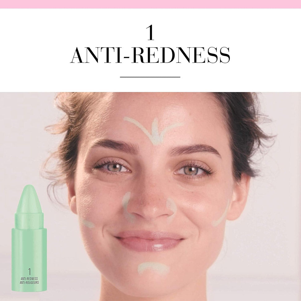 • Apply the green shade to the forehead, chin, cheeks and side of the nose for an anti-redness effect.