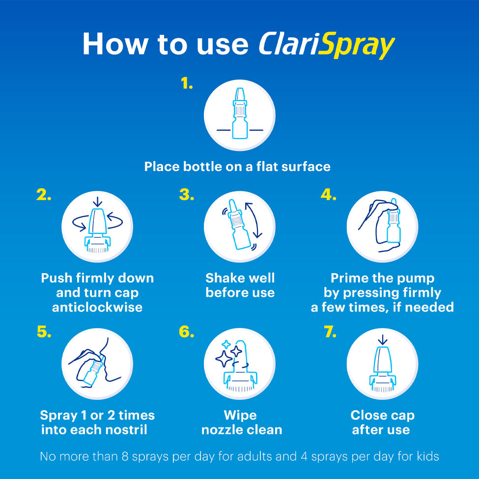 Clarispray Original spray provides fast and effective relief from nasal congestion caused by colds, allergies, or sinusitis.