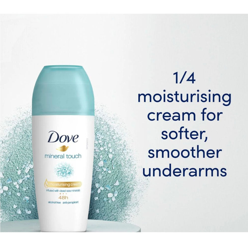 • Dove Mineral Touch Roll-On Deodorant 50ml is an antiperspirant that provides up to 48 hours of protection and contains Dead Sea minerals and a quarter moisturizing cream.