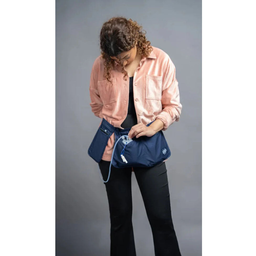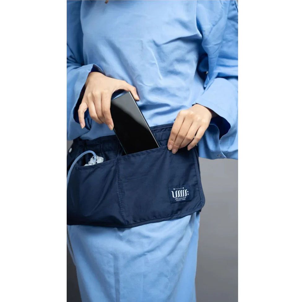 A washable fabric belt that holds the drainage bag (fluid drainage tubes) and facilitates mobility with it.