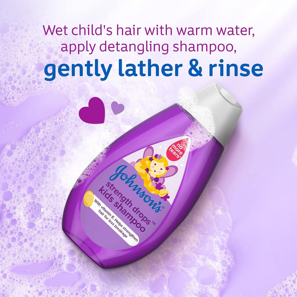 Johnson's Strength Drops Kids shampoo has been developed with the NO MORE TEARS formula, enriched with Vitamin E, that boosts hair's natural strength, reducing breakage and leaving it strong and healthy.