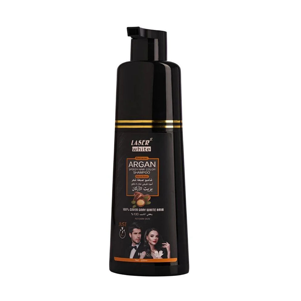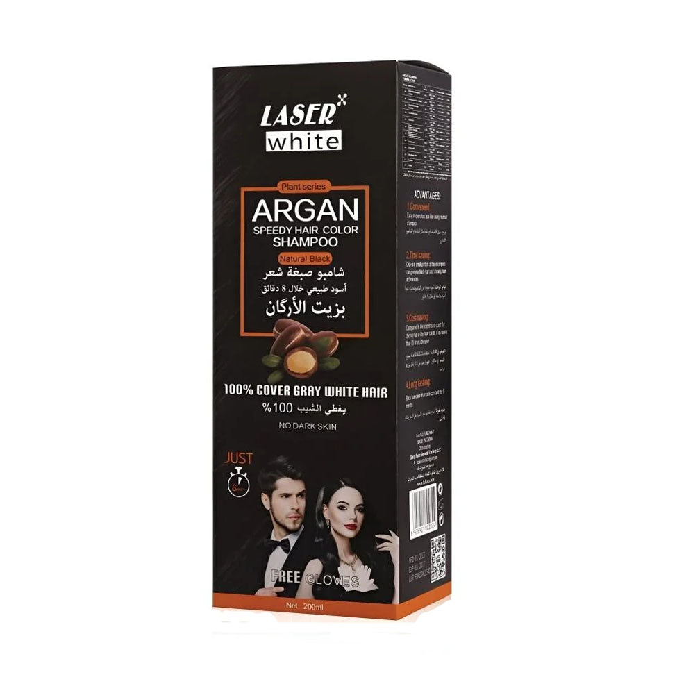 Give your hair a rich and shiny color with Laser White Argan Shampoo Dye – Black 200 ml. It combines hair nourishment and hydration with a long-lasting uniform black color.