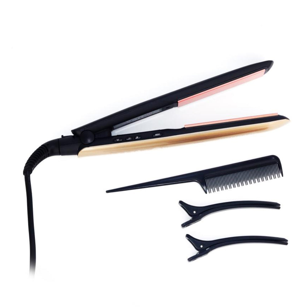 Integrated styling accessories, including a fine comb and clips for easy hair sectioning during styling.
