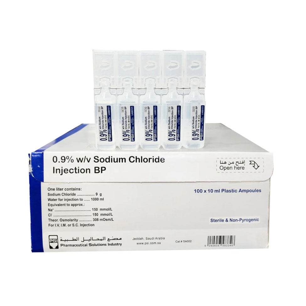 This product consists of 0.9 grams of sodium chloride (salt) in every 100 ml of water.