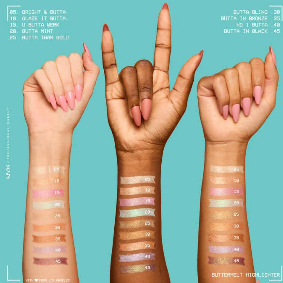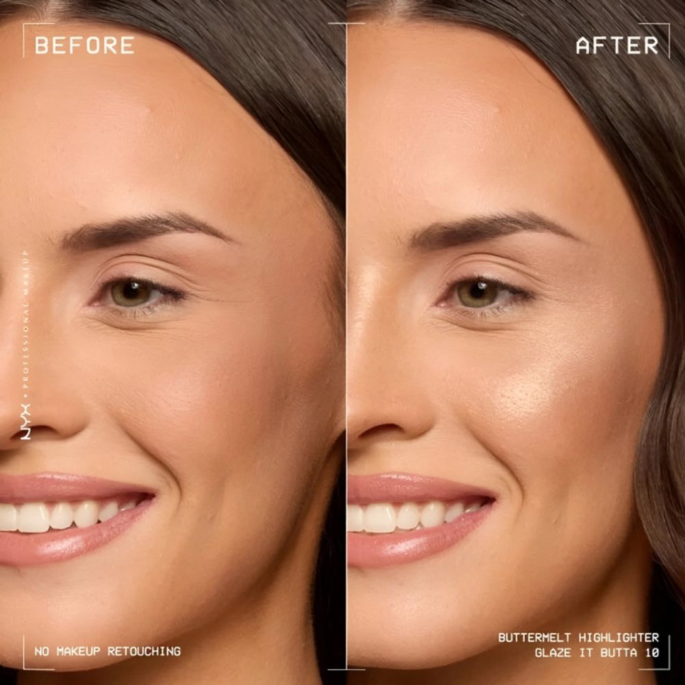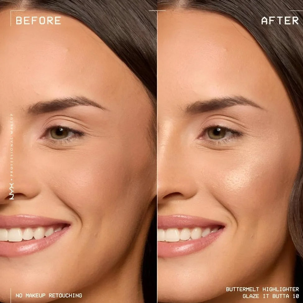 Illuminate your features with the NYX Butter Melt Highlighter in Shade 10 – Glaze It Butta. This creamy, blendable formula glides smoothly onto the skin, giving a radiant, buildable glow from subtle shimmer to intense shine. Perfect for highlighting cheekbones, the bridge of the nose, and brow bones for a luminous, all-day glow.