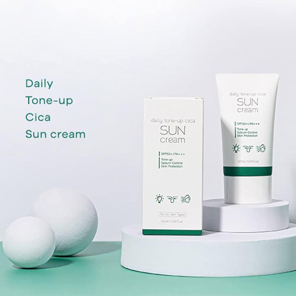 A sunscreen with a lightweight formula containing cica ingredients that gently spreads on the skin, giving it a natural color and a smooth finish.