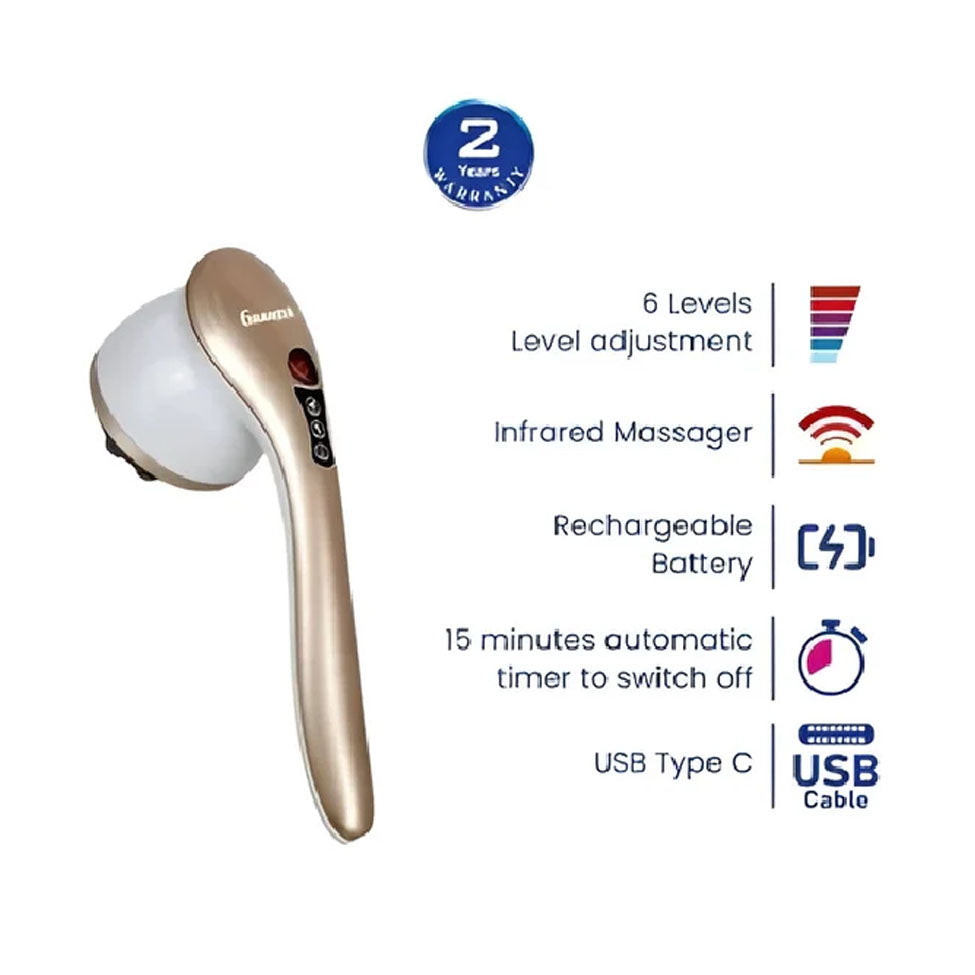 جهاز تدليك LY-655A سبينكس من جرانزيا هو مدلك طرق متطور يخفف من توتر العضلات العميق من خلال حركة الطرق الإيقاعية وتدليك الاهتزاز. يتميز بتصميم عملي وفعال يوفر الراحة للعضلات المتعبة بعد التمارين الرياضية أو الأنشطة اليومية. يأتي مع بطارية ليثيوم قابلة لإعادة الشحن عبر USB من النوع C، مع مستويات قابلة للضبط ورؤوس تدليك قابلة للتبديل لتجربة تدليك مخصصة. يتميز بضوضاء أقل للاستخدام المريح.