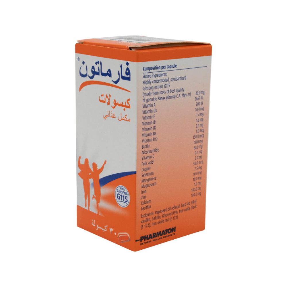 كبسولات فيتالتي 30 من فارماتون تحتوي على مستخلص الجينسنغ G115، الفيتامينات المتعددة، والمعادن لتعزيز التركيز ومستويات الطاقة. تعمل هذه المكملات الغذائية على تقليل التوتر وتعزيز جهاز المناعة.