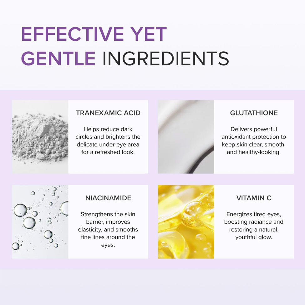- يمنحكِ منطقة محيط عين مشرقة بفضل مزيج "حمض الترانيكساميك والجلوتاثيون" الذي يستهدف التصبغات ويفتّح البقع الداكنة.
