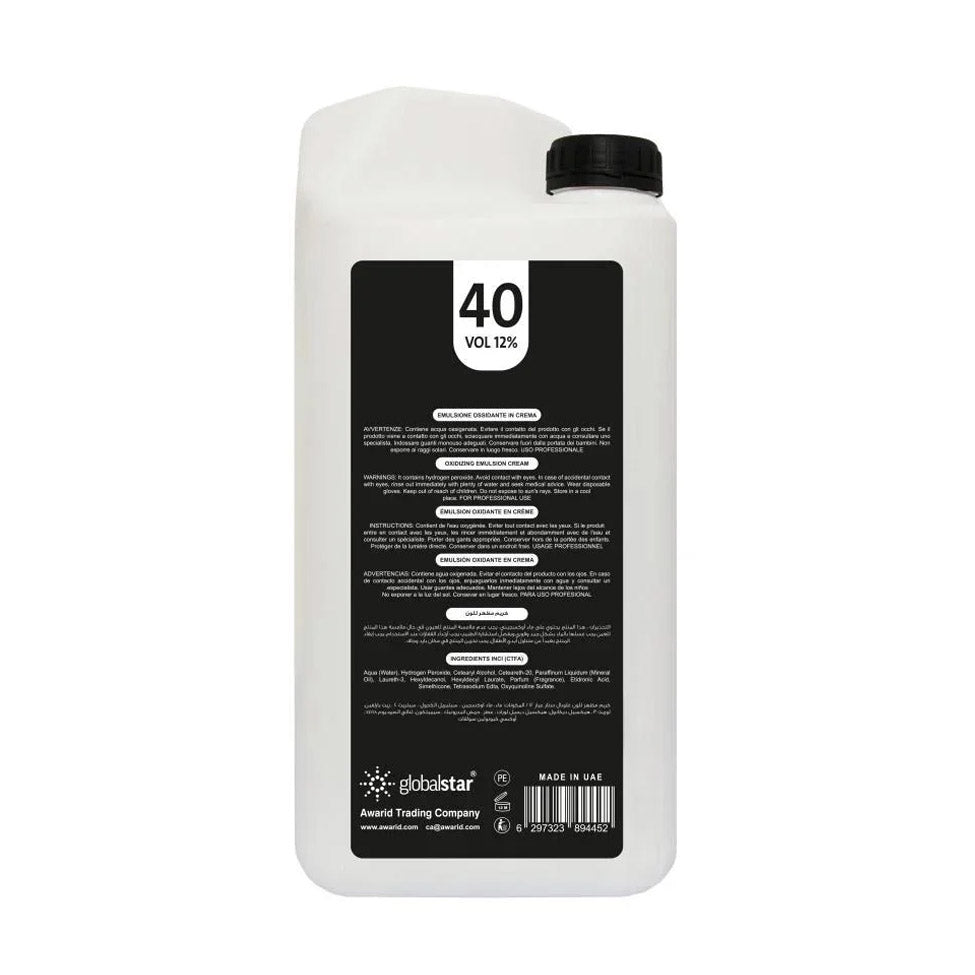 احصلي على تنظيف فعّال للشعر مع أكسجين جالون معطر 40% من جلوبال ستار بحجم 5 لتر، يمنح شعرك تفتيحًا قويًا ولونًا متجانسًا مع رائحة منعشة أثناء الصبغة.