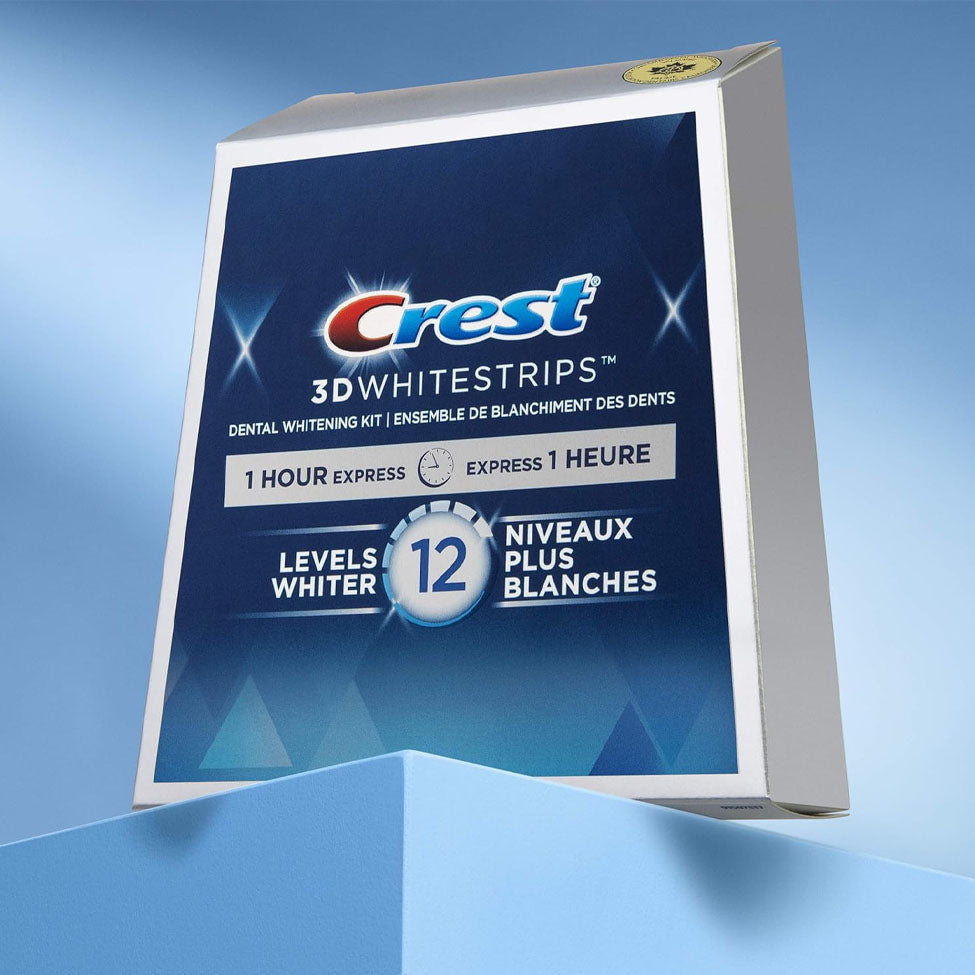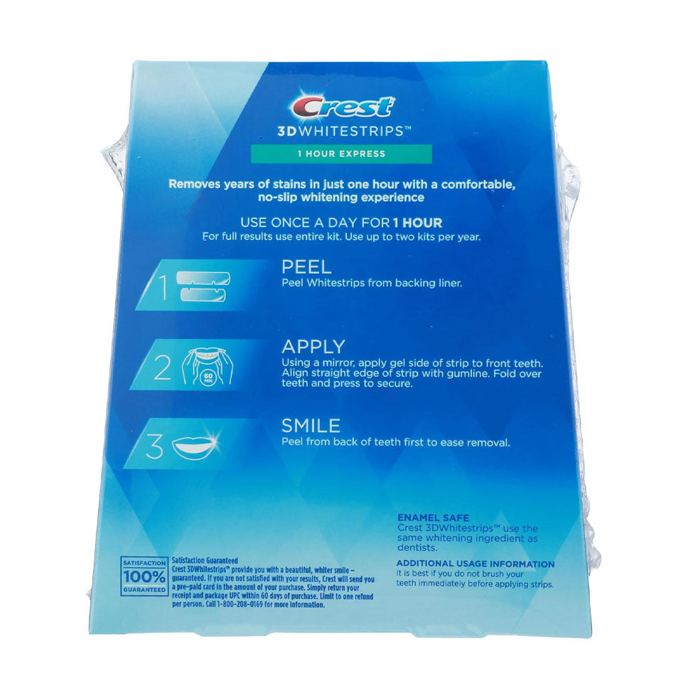 • Crest 3D Whitestrips 1 Hour Express Whitening هو علاج لتبييض الأسنان مصمم لإزالة سنوات من البقع خلال ساعة واحدة فقط. فيما يلي بعض الميزات الرئيسية: