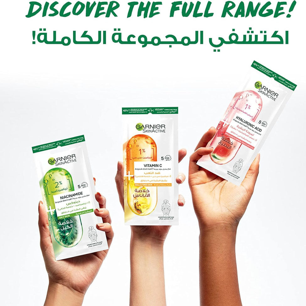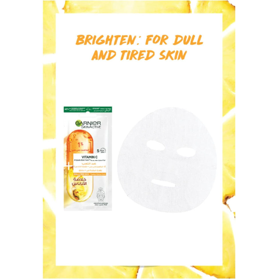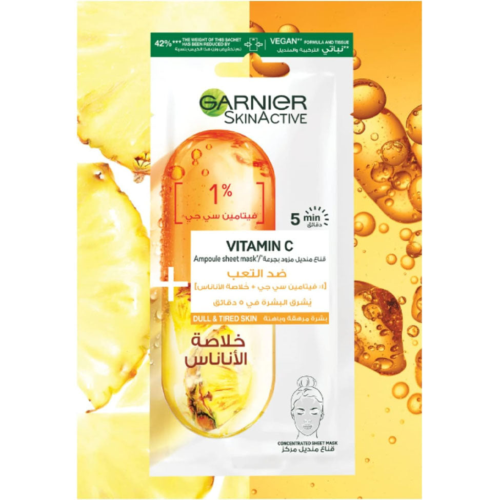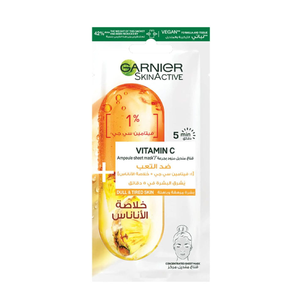 قناع أمبولة من غارنييه مخصص لإشراقة البشرة بتركيبة غنية بفيتامين C والأناناس، يساعد في تقليل البهتان وتوحيد لون البشرة، مع توفير ترطيب فوري وإشراقة طبيعية.