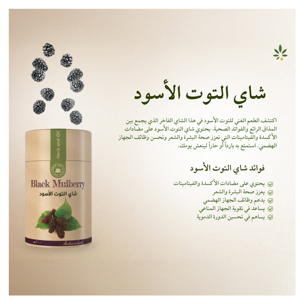 شاي التوت الأسود الطبيعي من عشبة وزيت بنكهة التوت الأسود الغنية والمميزة. تركيبته الطبيعية غنية بمضادات الأكسدة والفوائد الصحية، لتستمتع بمشروب لذيذ ومنعش يدعم صحتك وحيويتك بطريقة طبيعية.