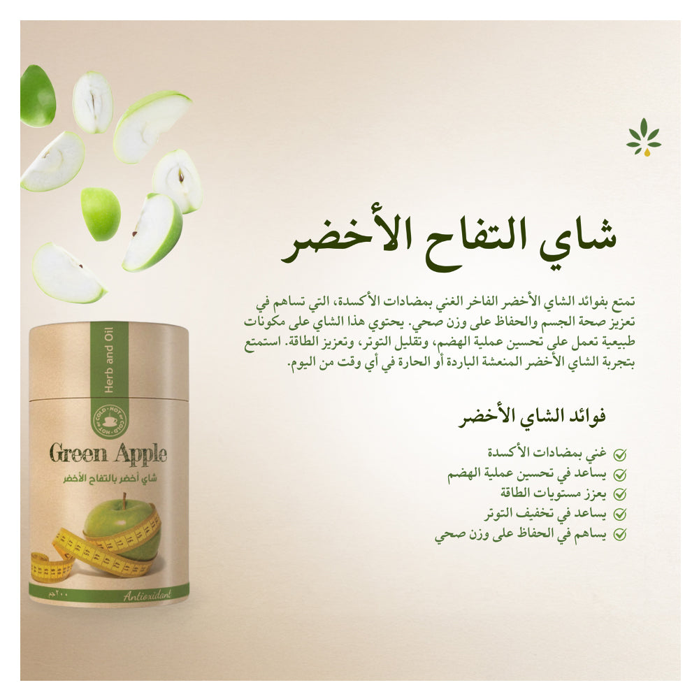 شاي أخضر طبيعي من عشبة وزيت بنكهة التفاح المنعشة. تركيبته الطبيعية غنية بمضادات الأكسدة والفوائد الصحية، لتستمتع بمشروب لذيذ ومنعش يدعم صحتك وحيويتك بطريقة طبيعية.