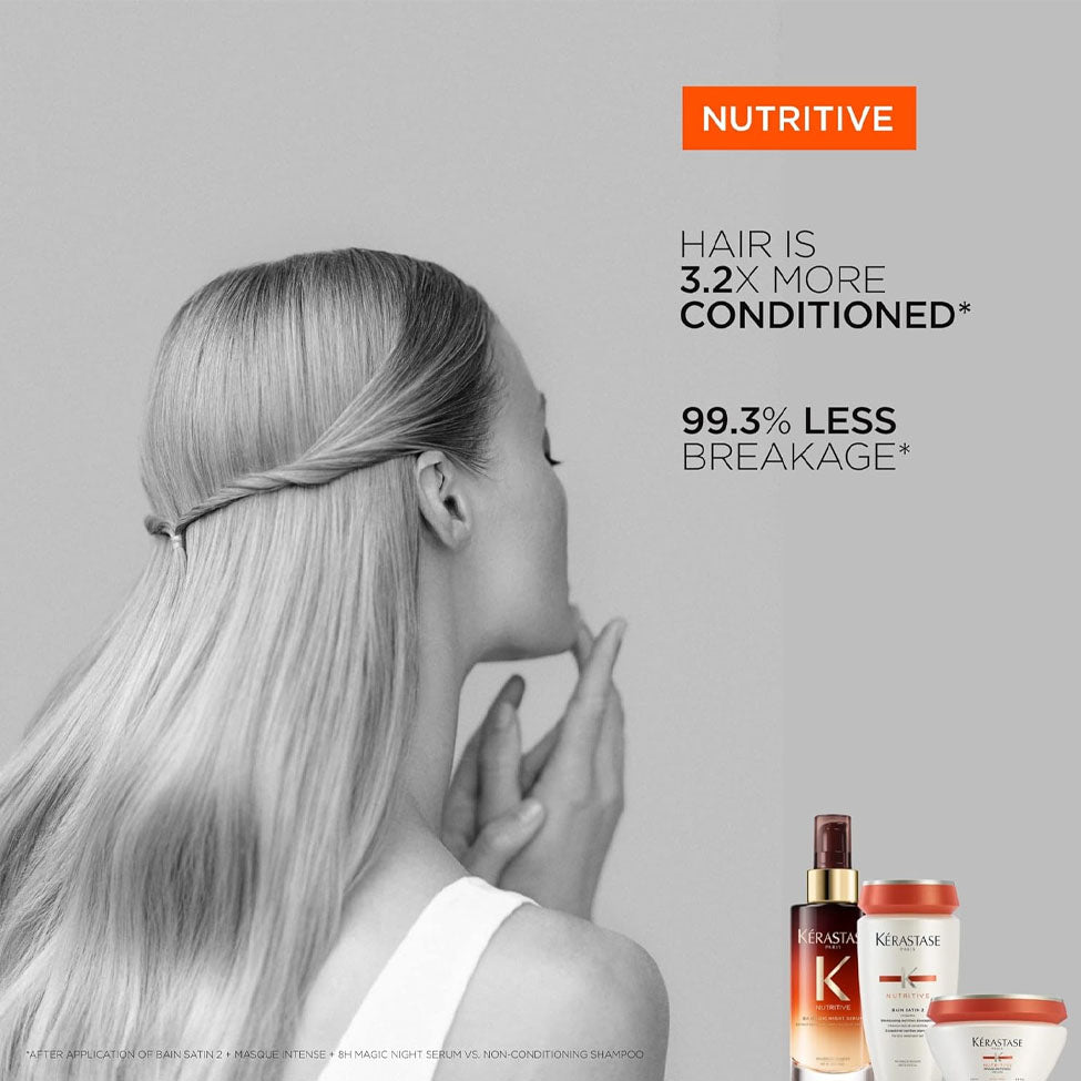 سيروم ليلي فاخر من كيراستاس مصمم خصيصاً للشعر الجاف والمتعطش للتغذية. تركيبته المتطورة تعمل طوال الليل لمدة 8 ساعات لتغذية الشعر بعمق وترطيبه، لتستيقظي على شعر ناعم وحريري ومتجدد بلمعان صحي طبيعي.