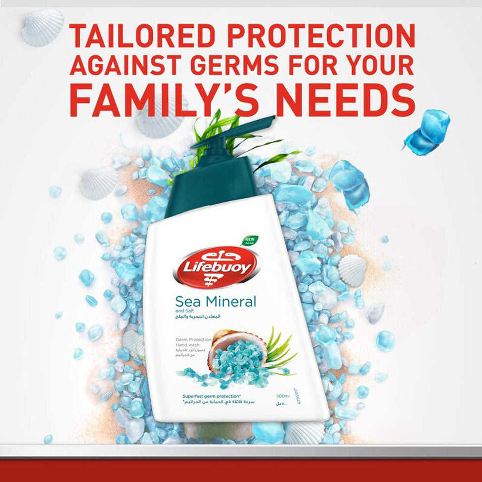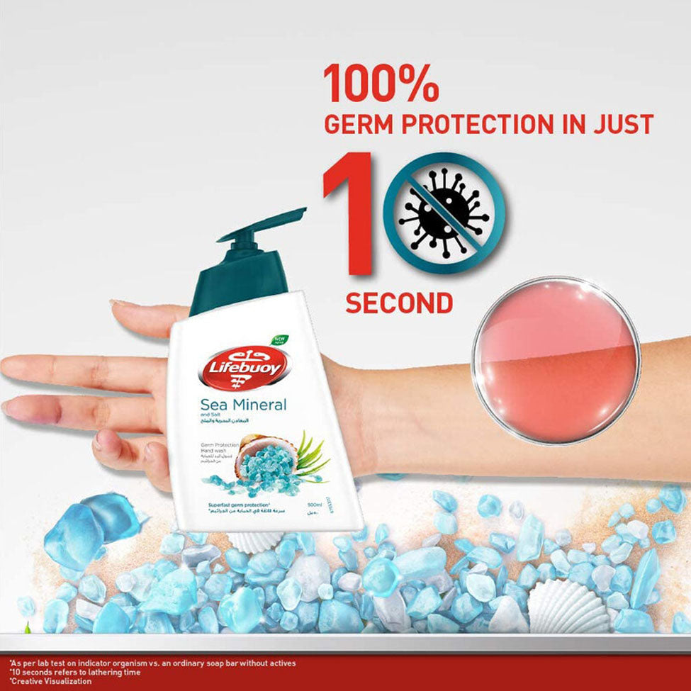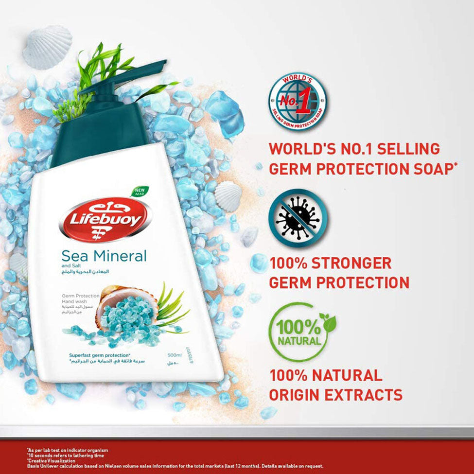 غسول اليدين لايف بوي بالمعادن البحرية 500 مل، تركيبة فعالة تنظف اليدين وتزيل 99.9% من الجراثيم، مع ترك اليدين منعمتين ومنتعشتين برائحة البحر المنعشة.