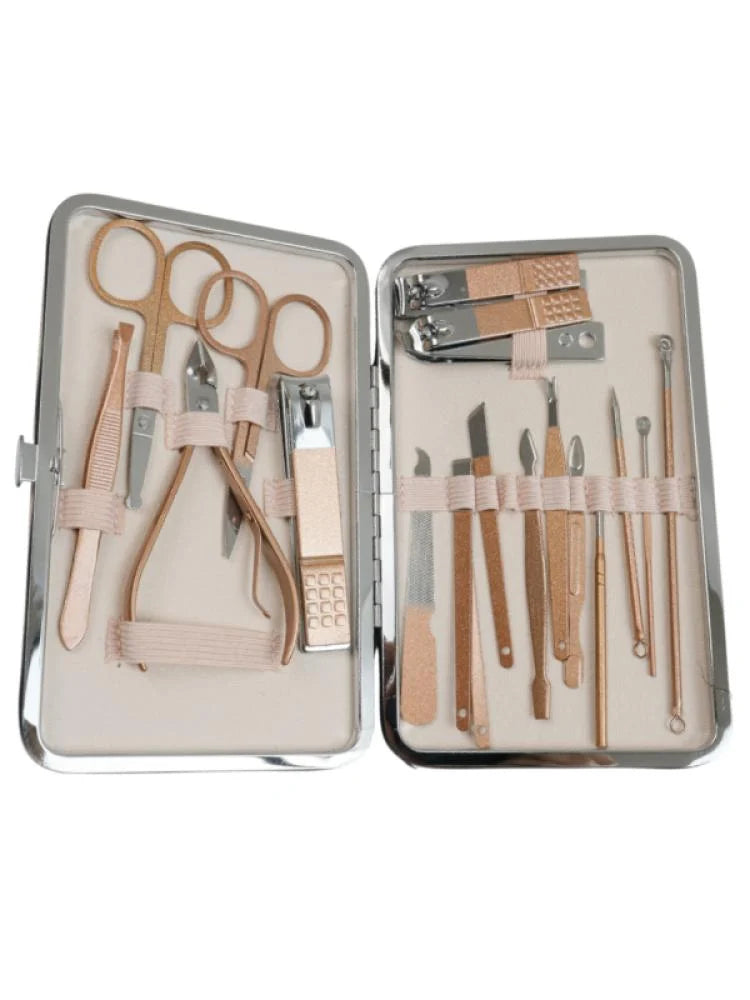 متكاملة للعناية بالأظافر واليدين والقدمين، تحتوي على أدوات احترافية من الستانلس ستيل المقاوم للصدأ، مما يضمن متانة عالية وحلاقة دقيقة وآمنة.
