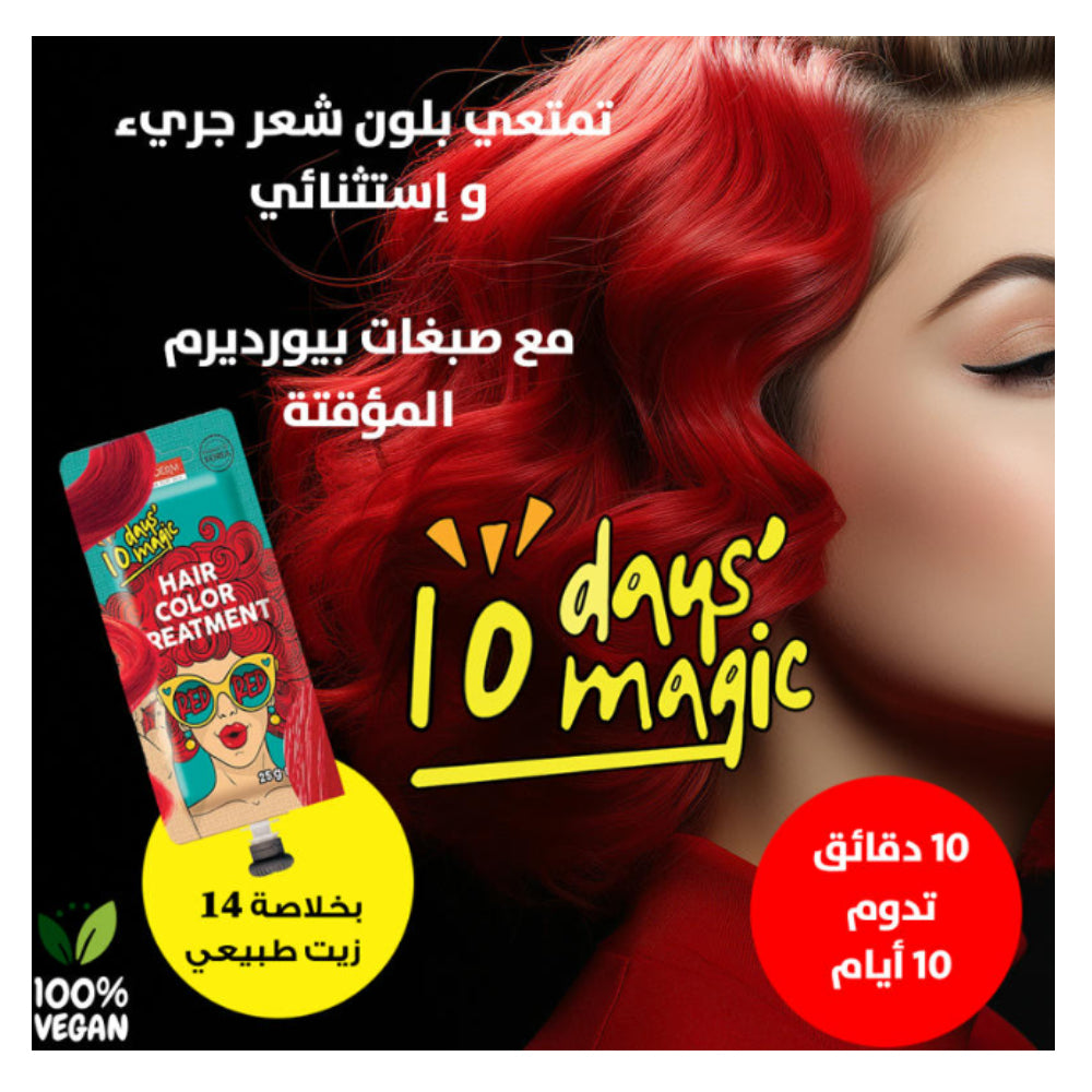 صبغة الشعر المؤقتة عبارة عن تلوين وتغذية للشعر تدوم لمدة 10 أيام ولا تحتوي على الأمونيا ولا تسبب تلف الشعر.