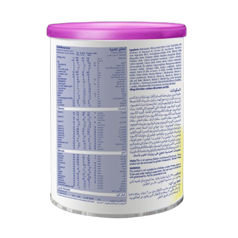 المكونات: مالتوديكسترين ، بروتين مصل اللبن (من بقرة) ، زيوت نباتية (زيت عباد الشمس ، زيت بذور اللفت ، زيت جوز الهند) ،سكروز ، دهون ثلاثية متوسطة السلسلة (MCT) ، سكريات فركتوليغو (FOS) ، أملاح معدنية (سترات المغنيسيوم ، كلوريد البوتاسيوم ، ثنائي فوسفات ثنائي الصوديوم ، سترات البوتاسيوم ، فوسفات الكالسيوم أحادي القاعدة ، كلوريد الكالسيوم ،هيدروكسيد الكالسيوم ، سترات الكالسيوم ، سترات الصوديوم ، كربونات الكالسيوم ، كبريتات الحديدوز ، كبريتات الزنك ، كبريتات النحاس ، كبريتات المنغنيز ، كلوريد الكروم ، يوديد البوتاسيوم ، موليبدات الصوديوم ، سيلينيت الصوديوم) (زيت السمك [مصدر DHA]) ، مستحلب (ليسيثين دوار الشمس) ، كلوريد الكولين ، فيتامينات (فيتامين سي ، نيكوتيناميد ، فيتامين إي ، بانتوثينات الكالسيوم ، فيتامين ب 2 ، فيتامين ب 6 ، فيتامين ب 1 ، فيتامين أ ، حمض الفوليك ، البيوتين ، وفيتامين ك ، وفيتامين د ، وفيتامين ب 12) ، وتخمير اللاكتيك (بكتريا إنفانتيس ، إل رامنوسوس) ، إينوزيتول ، نكهة طبيعية متطابقة (فانيلين) ، إل-كارنيتين ، مضادات الأكسدة (مزيج من توكوفيرول ، أسكوربيل بالميتات).